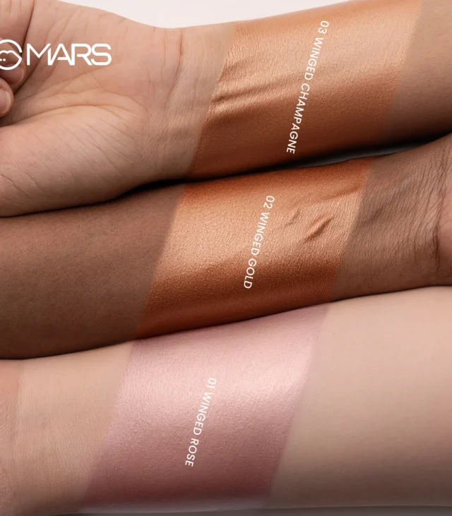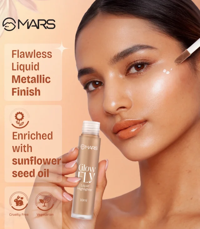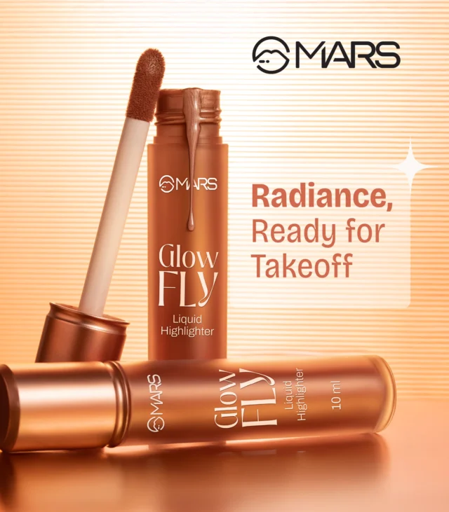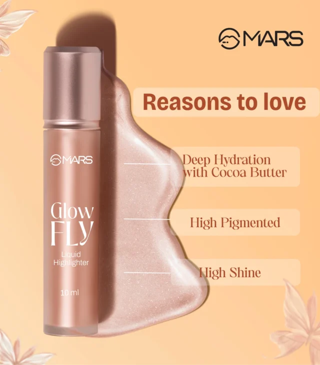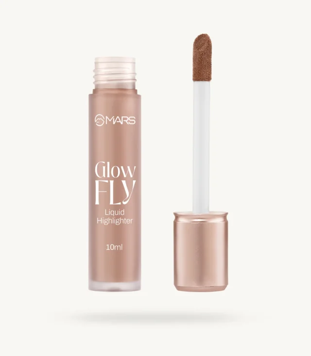 MARS Glow fly Liquid Highlighter, Your shortcut to that lit-from-Within glow. This ultra-refined formula delivers a liquid metal finish without a trace of chunky shimmer, giving your skin a smooth, luminous sheen that looks effortlessly natural.