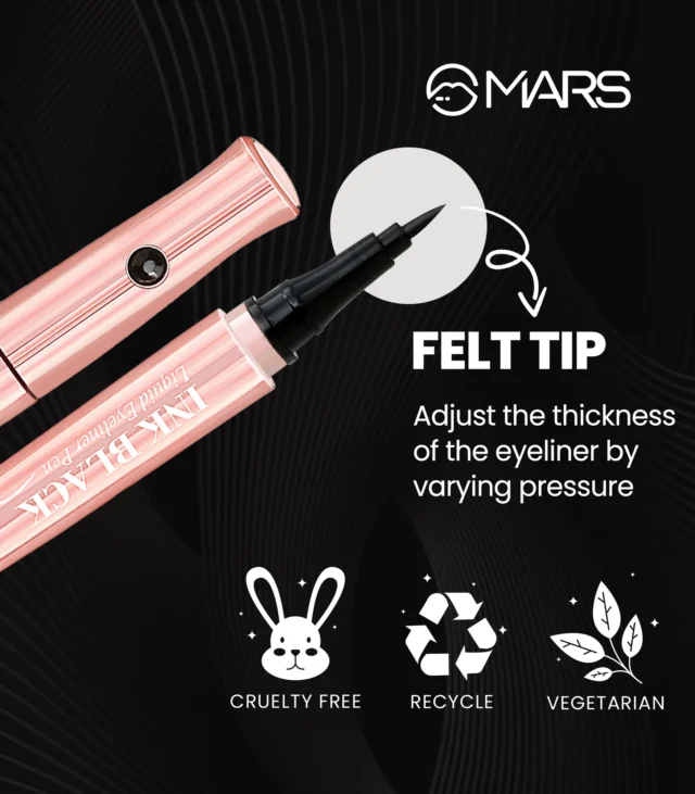MARS Ink Black Eyeliner is a sketch-pen style liner with a rich, intense black color. Its water-resistant, quick-drying formula lasts long and delivers a bold, dramatic look. The long handle offers a comfortable grip, making it easy to create sharp, defined lines and glam up your eyes.